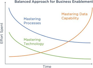 Developing a business-enabled capability also differs from the traditional IT approach in that it requires an ongoing and balanced assessment of people, processes, and technology. It requires more time and effort initially for business users to gain hands-on experience mastering data and defining or improving processes for data management and governance. This is time-consuming work and should be balanced in initial data mastering projects that have a more straightforward definition and less complexity – those can be tackled later.