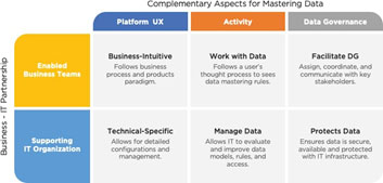 From a data architecture perspective, a single platform also centralizes a data catalog of mastered data entities for other business groups and developers. IT teams still support operationalizing mastered data for performance, scalability, and safeguarding.